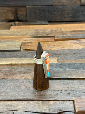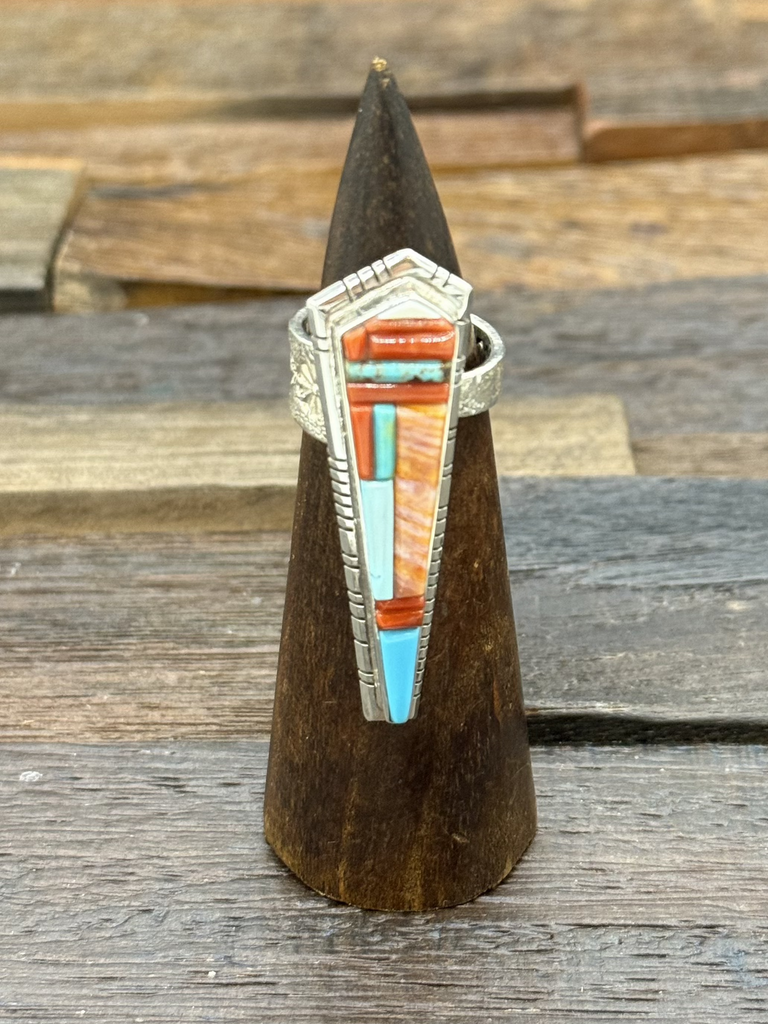 This handmade cobblestone inlay ring is made by Navajo artist David Tune. Stones include turquoise, coral, and spiny oyster shell.  Measures about ...