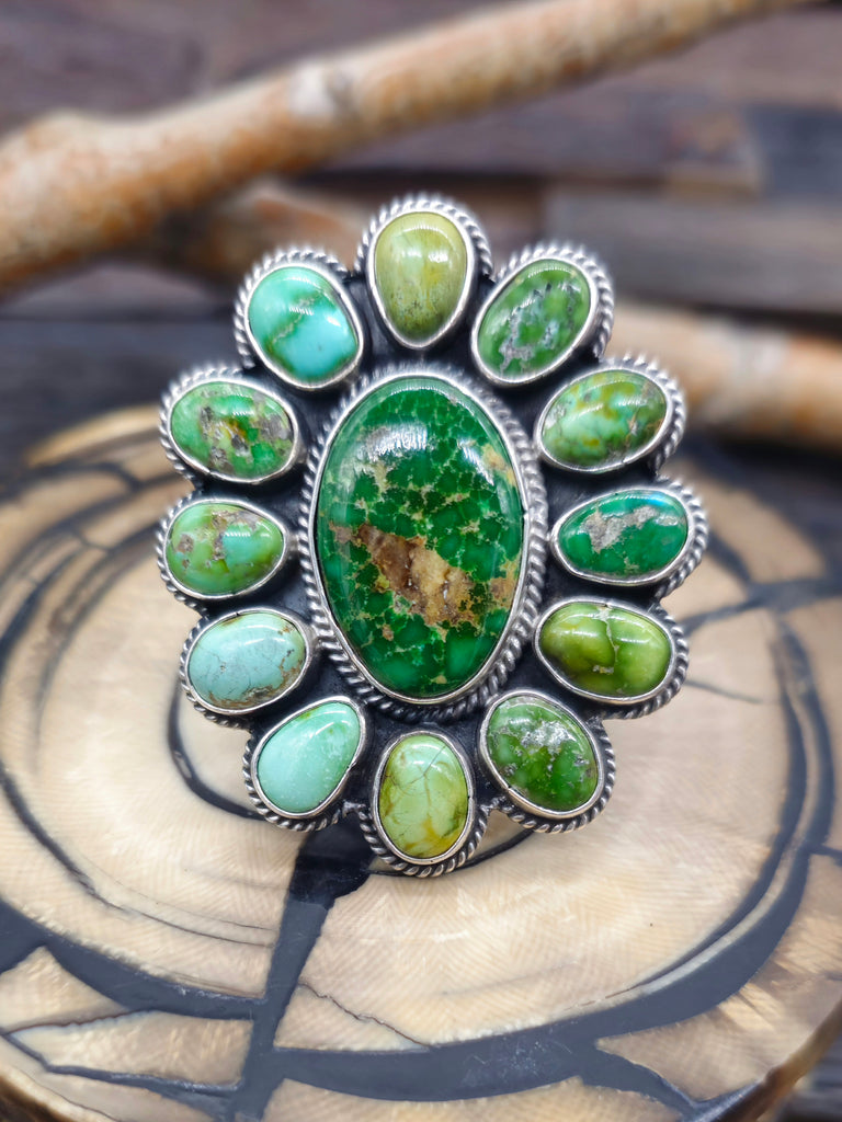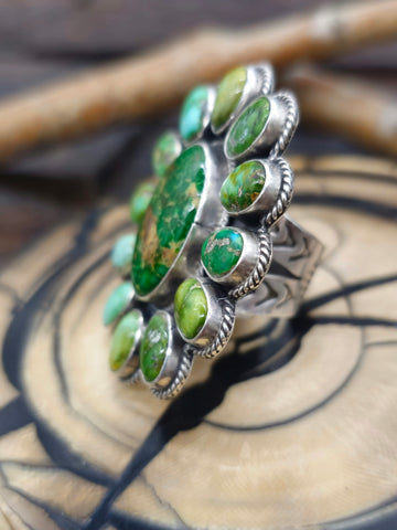 This sterling silver ring features a cluster of rich green Sonoran Turquoise, delicate silver ropes, and a stamped shank.  Made by Navajo silversmi...
