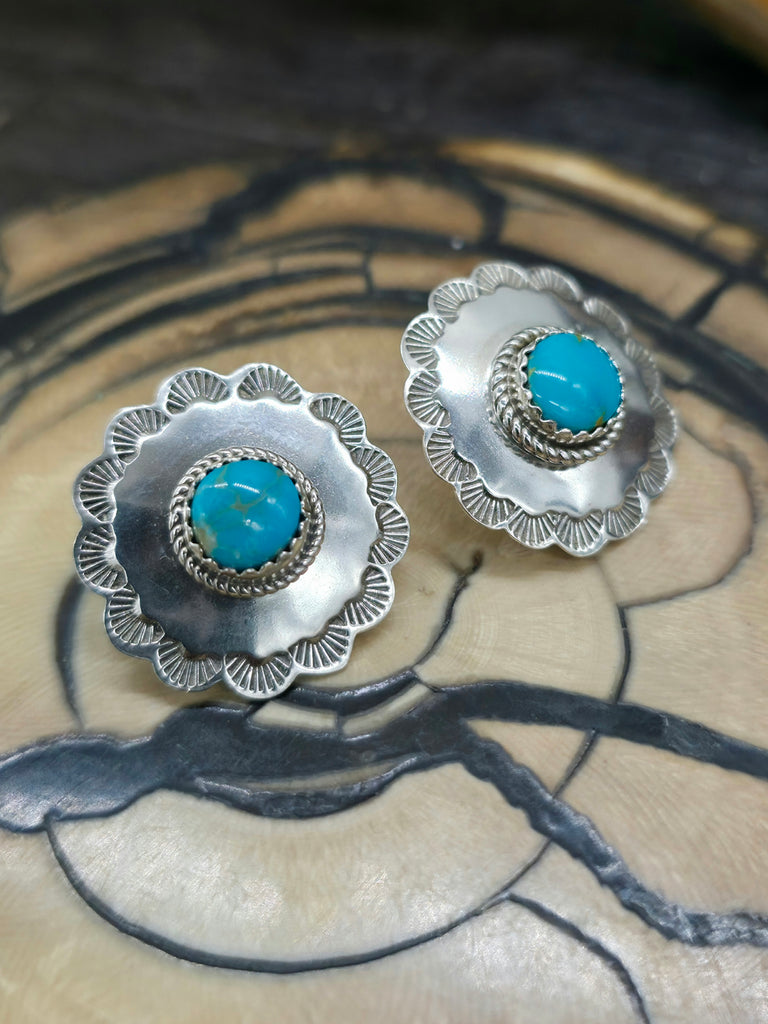Round Stamped Sterling Silver Turquoise Post Earrings by Navajo silversmith Lucille Platero All jewelry is handcrafted by Indigenous Artists.  Indi...