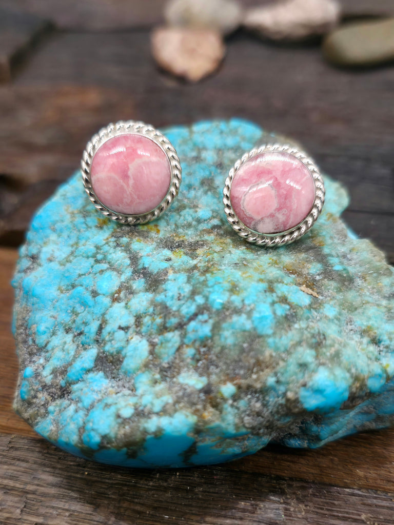 Round Post Sterling Silver Rhodochrosite Earrings by Navajo silversmith Nikoli Ashley. All jewelry is handcrafted by Indigenous Artists.  Individua...