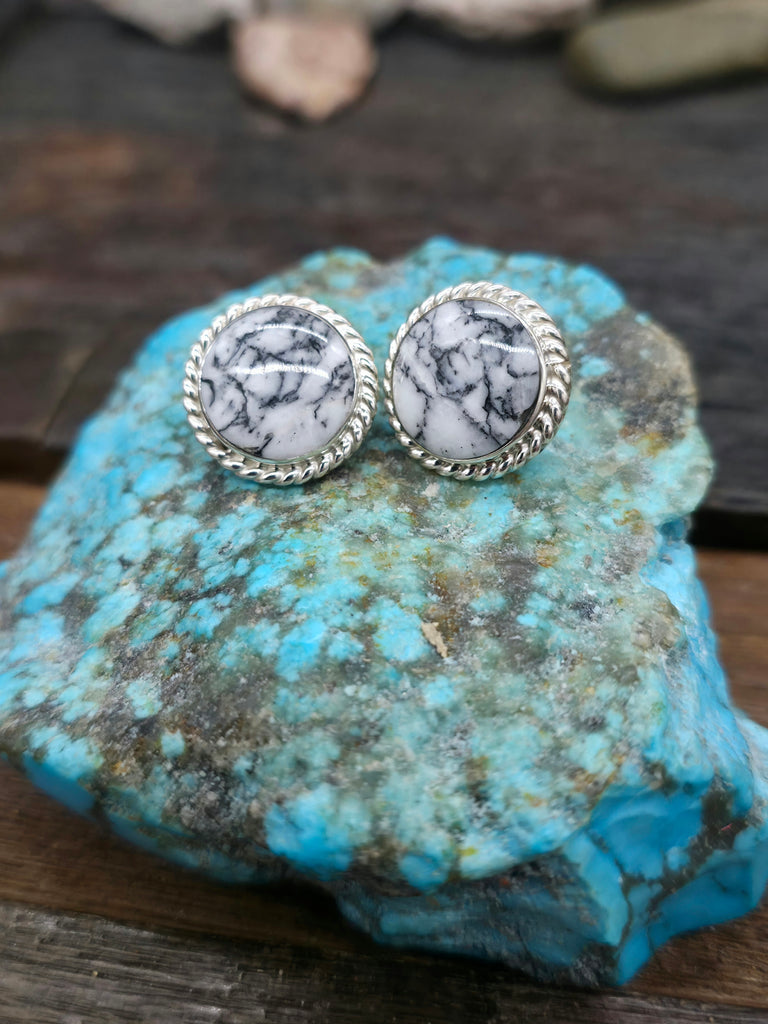 Round Post Sterling Silver White Feather Jasper Earrings by Navajo silversmith Nikoli Ashley. All jewelry is handcrafted by Indigenous Artists.  In...
