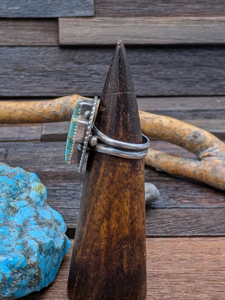 Royston Turquoise Cross Ring Size 7.75 by Navajo artist L. Archuleta All jewelry is handcrafted by Indigenous Artists.  Dimensions: Size 7 3/4
