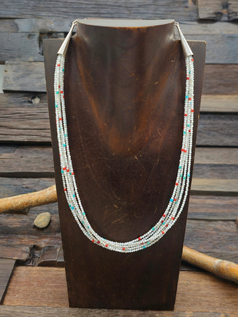 Seven Strand Necklace with Turquoise, Coral, and Mother of Pearl by Navajo Jewelry artist Melvin Masquat.   All jewelry is handcrafted by Indigenou...