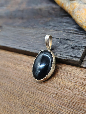 Small Black Onyx Oval Pendant by Navajo silversmith Benny Tahe. All jewelry is handcrafted by Indigenous Artists.  Dimensions: Length - 1 1/2 in...