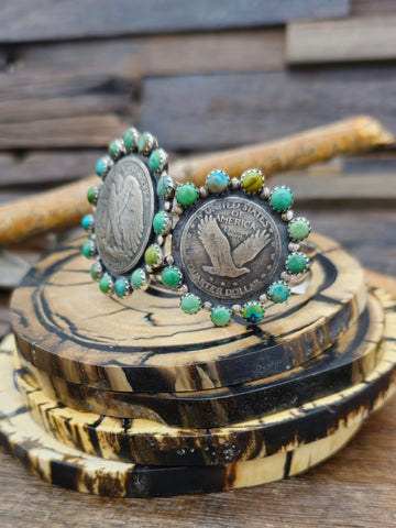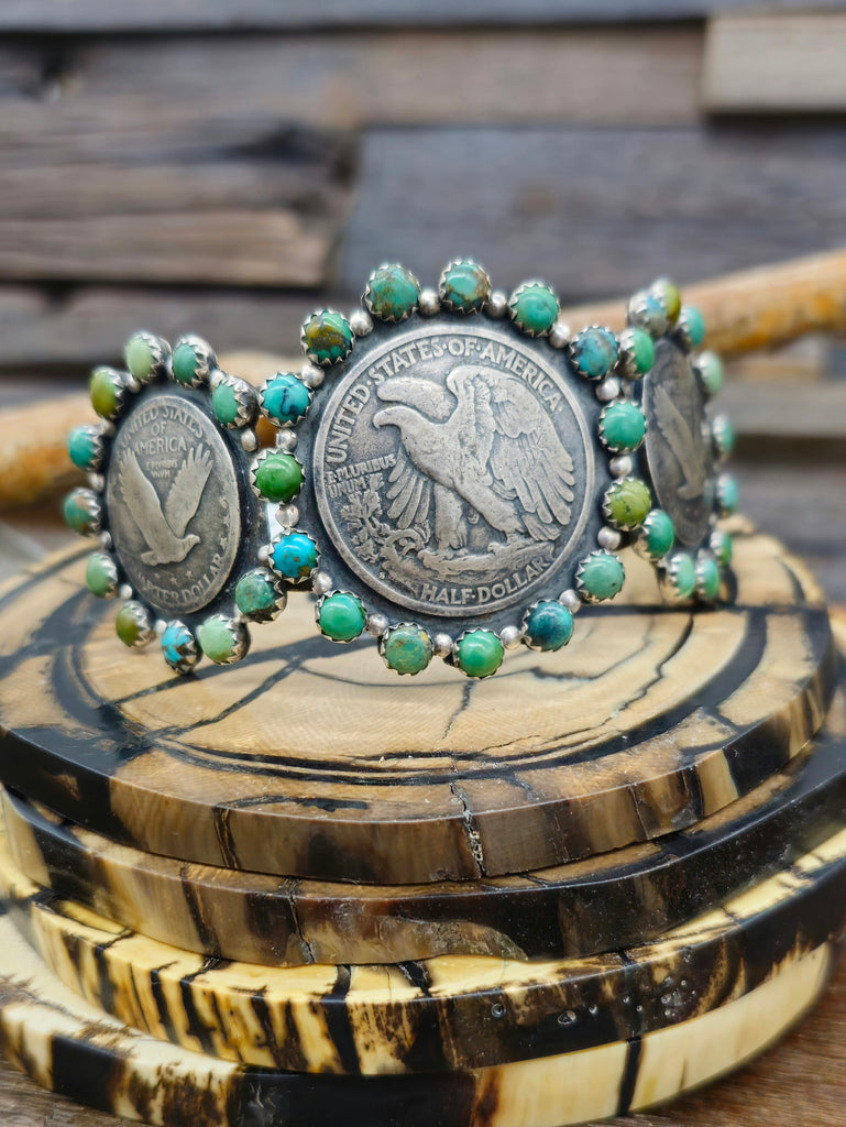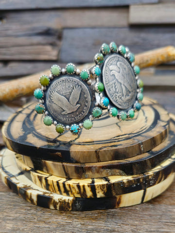 Eagle Quarter and Half Dollar Coins Green Turquoise Cuff by Navajo silversmith L. Archuleta. All jewelry is handcrafted by Indigenous Artists.  ...