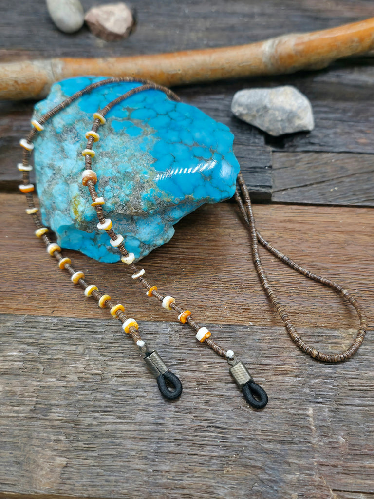 Spiny Oyster and Dark Heishi Eyeglass Chain by Santo Domingo jewelry artist Ramona Bird. Glasses not included, shown for display purposes only. All...