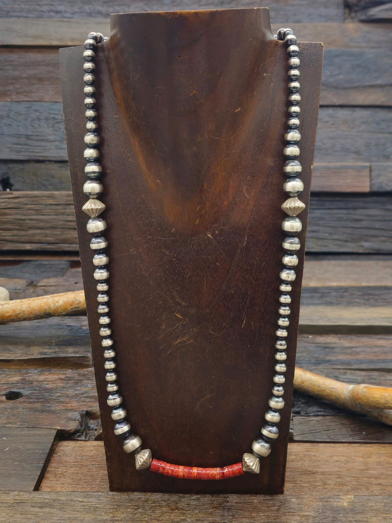Oxidized Sterling Silver Bead and red Sponge Coral Necklace by Fred Archuleta.  All jewelry is handcrafted by Indigenous Artists.  Dimensions: L...
