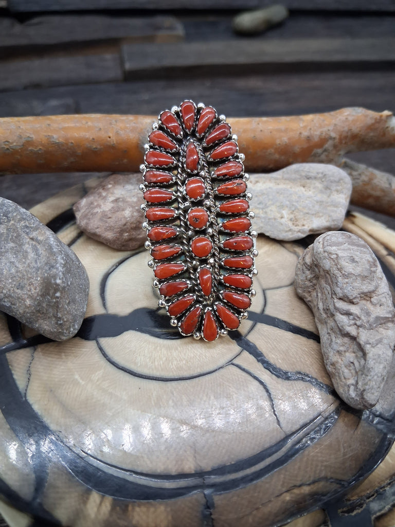 Sterling Silver Coral Inlay Oval Ring Size 7.  Made by a Navajo silversmith Sarphina Wilson. All jewelry is handcrafted by Indigenous Artists.  ...