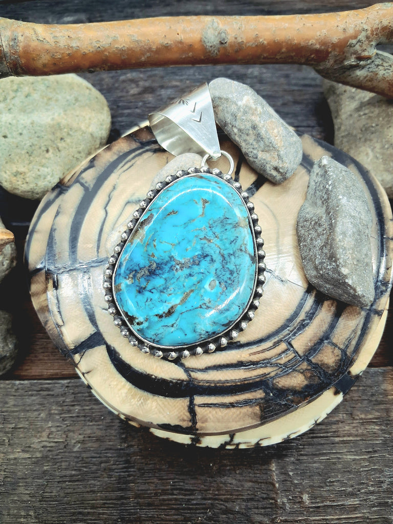 Sterling Silver Kingman Turquoise Raindrop Border Pendant 2 1/4" by Leonard Platero