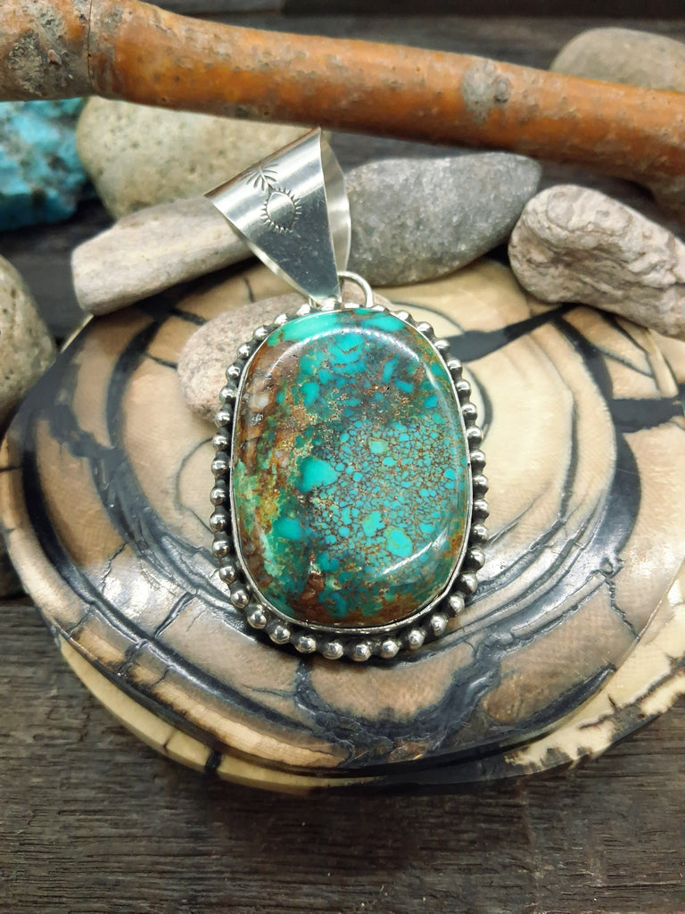 Sterling Silver Rectangular Turquoise Raindrop Border Pendant by Navajo Silversmith Leonard Platero. All jewelry is handcrafted by Indigenous Artis...