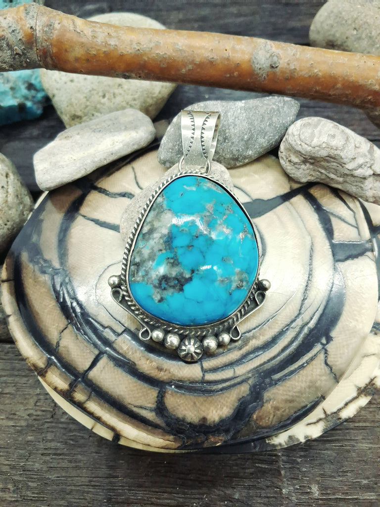 Sterling Silver and Kingman Turquoise Pendant by Navajo Silversmith, Rosella Paxton. All jewelry is handcrafted by Indigenous Artists.  Dimensio...
