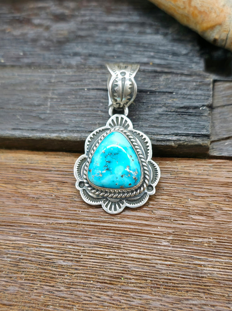 Stamped Sterling Silver and Blue Turquoise Pendant by Navajo silversmith Happy Piasso. All jewelry is handcrafted by Indigenous Artists.  Dimens...