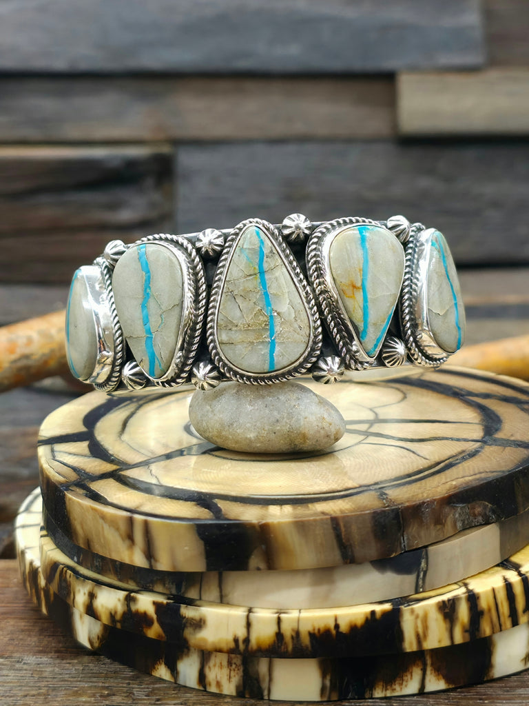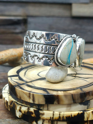 Stamped Sterling Silver and Blue Gem Ribbon Turquoise Cuff by Navajo silversmith Delbert Delgarito. All jewelry is handcrafted by Indigenous Artist...