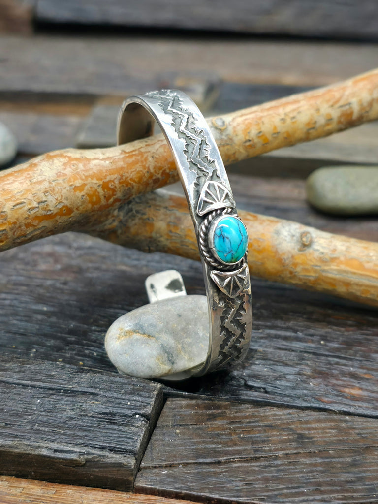 Stamped Sterling Silver and Turquoise Cuff by Sunshine Reeves - 6 1/4 in.