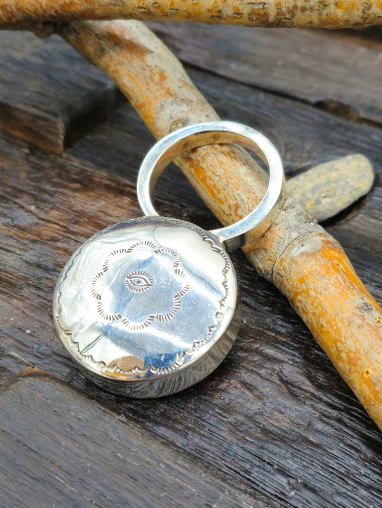 Stamped Sterling Silver Baby Rattle by Navajo silversmith Jeffrey Castillo. Individual stamp work may vary.  All jewelry is handcrafted by Indigeno...