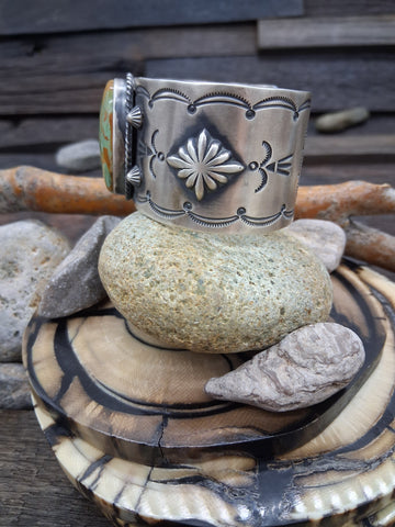 Stamped Sterling Silver Bracelet with Royston Turquoise Oval by Arnold Goodluck