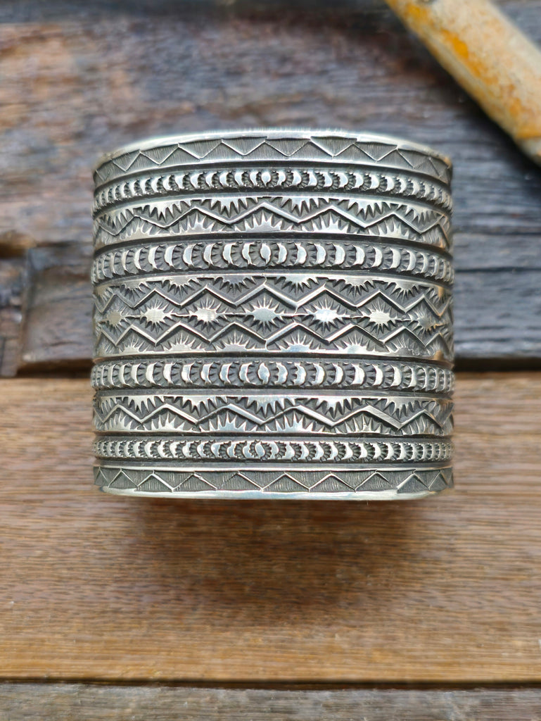 Stamped Sterling Silver Cuff by Navajo silversmith Sunshine Reeves. All jewelry is handcrafted by Indigenous Artists  Dimensions: internal Circu...