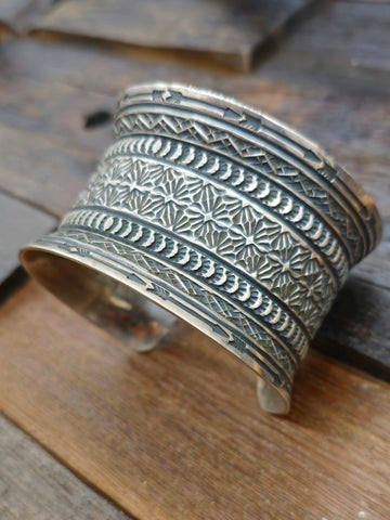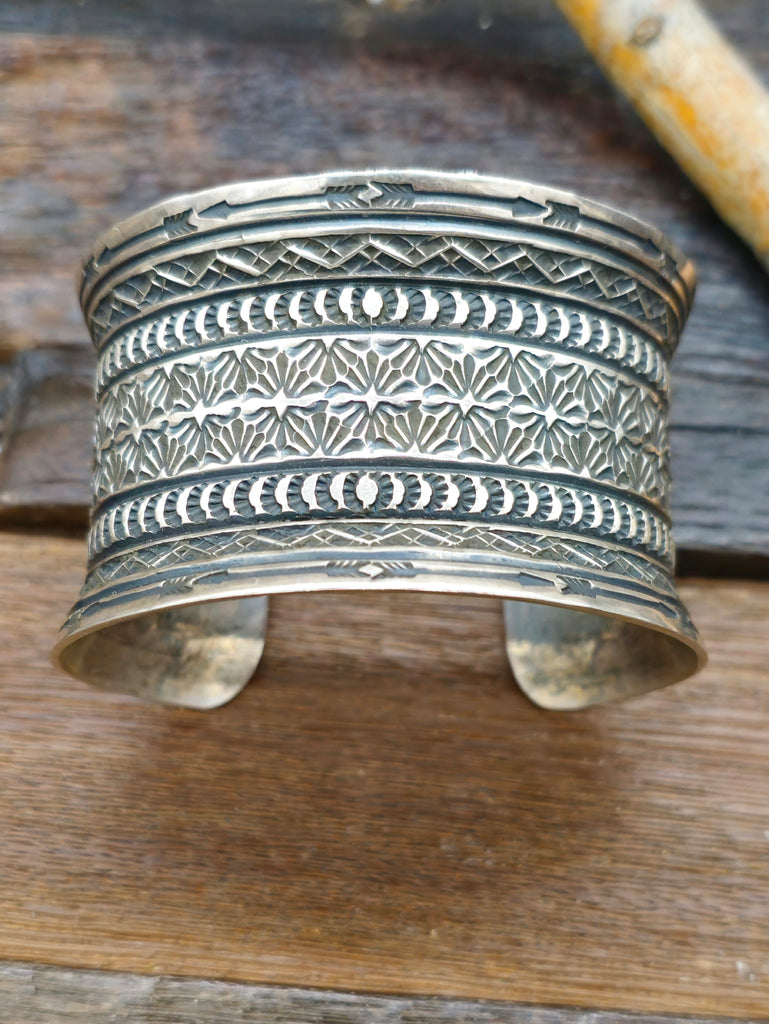 Stamped Sterling Silver Cuff by Navajo silversmith Sunshine Reeves. All jewelry is handcrafted by Indigenous Artists  Dimensions: internal Circu...