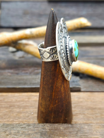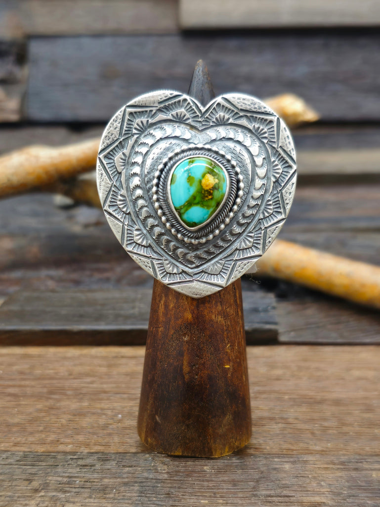 Stamped Sterling Silver Heart Ring with Sonoran Turquoise by Navajo silversmith Leon Martinez. All jewelry is handcrafted b y Indigenous Artists. ...