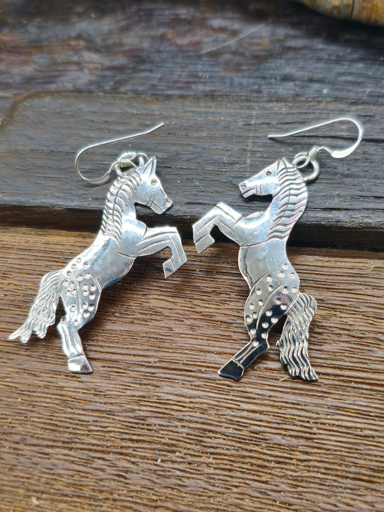 Stamped Sterling Silver Horse Earrings by Louise Yazzie All jewelry is handcrafted by Indigenous Artists.  Dimensions: 2 in. by 1/2 in.