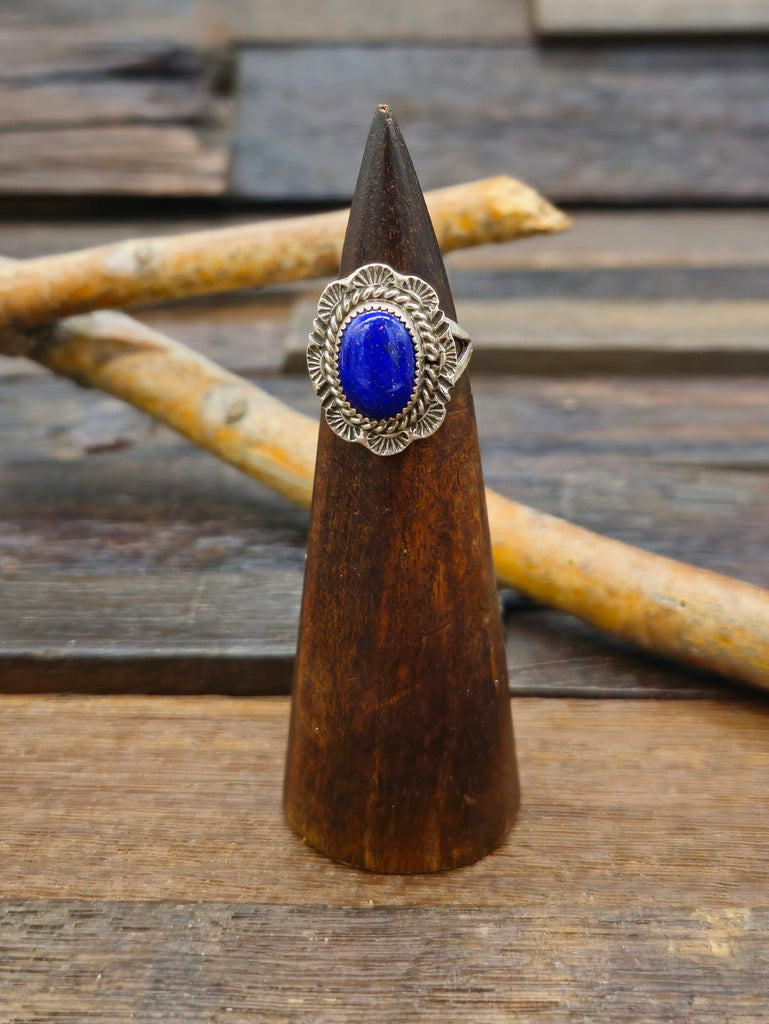 Stamped Sterling Silver Lapis Ring by Navajo silversmiths Bill and Priscilla Smith. All jewelry is handcrafted by Indigenous Artists.  Individual s...