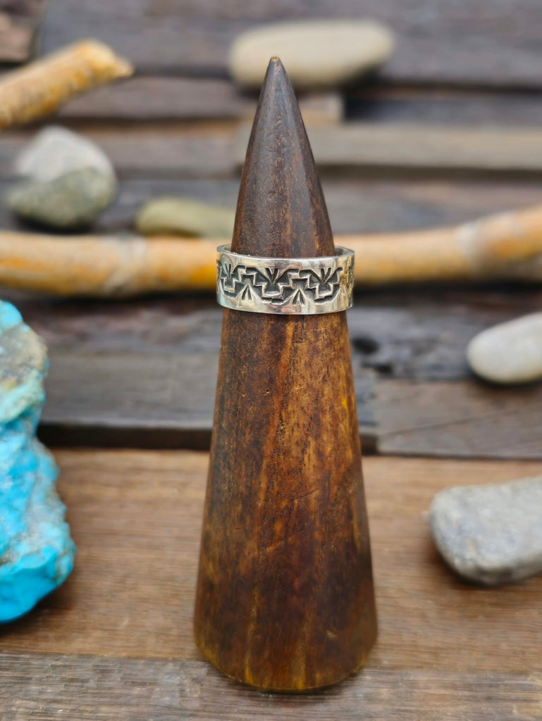 Stamped Sterling Silver Ring by Navajo silversmith Sunshine Reeves. All jewelry is handcrafted by Indigenous Artists.  Dimensions: Size 8.75