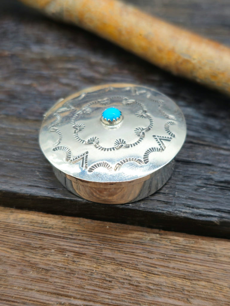 Stamped Sterling Silver Round Pill Case with Turquoise by Navajo silversmith Jeffrey Castillo Individual stamp work may vary.  All jewelry is handc...