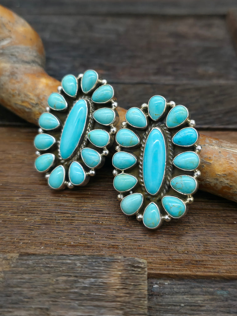 Sterling Silver Turquoise Oval Cluster Post Earrings by Navajo silversmith E.M. Linkin. All jewelry is handcrafted b y Indigenous Artists.  Dime...
