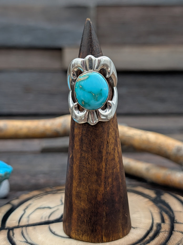 Sterling Silver Sonoran Turquoise Ring by Navajo Silversmith Isabelle Kee All jewelry is handcrafted by Indigenous Artists.  Dimensions: Size 8