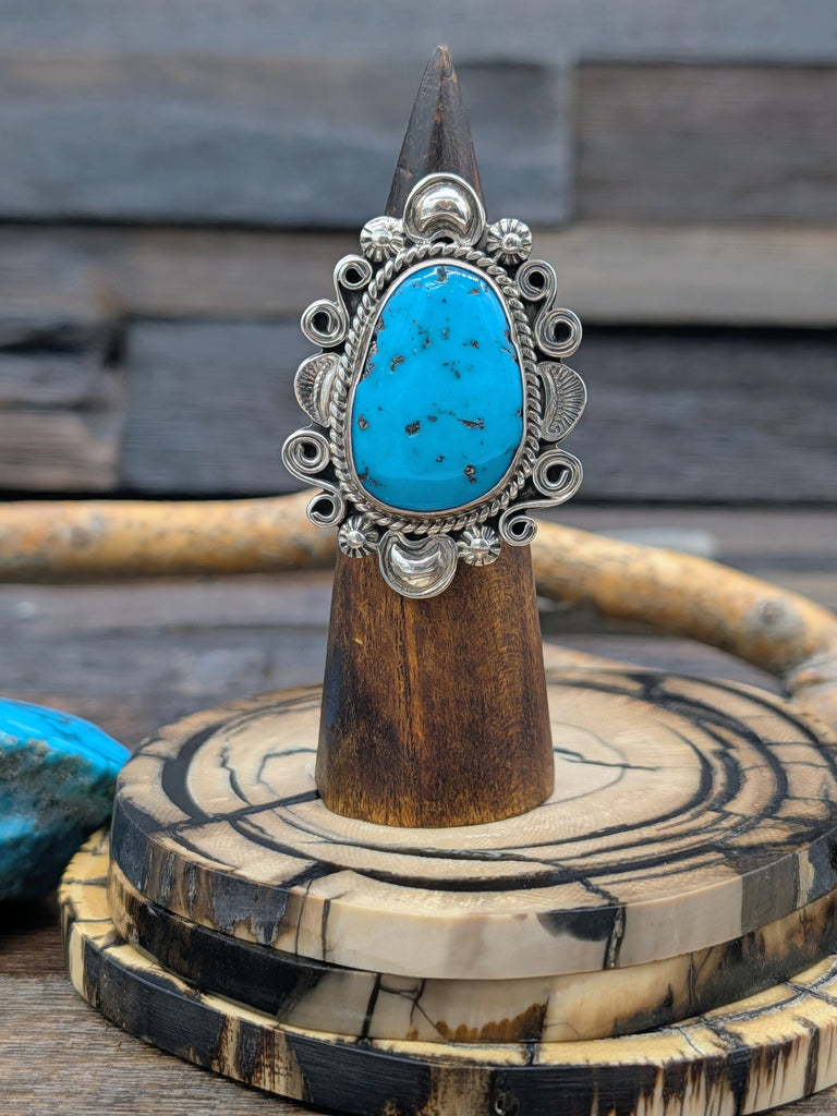 Sterling Silver and Kingman Turquoise Statement Ring by Navajo Silversmith, Jeff Largo All jewelry is handcrafted by Indigenous Artists.  Dimens...