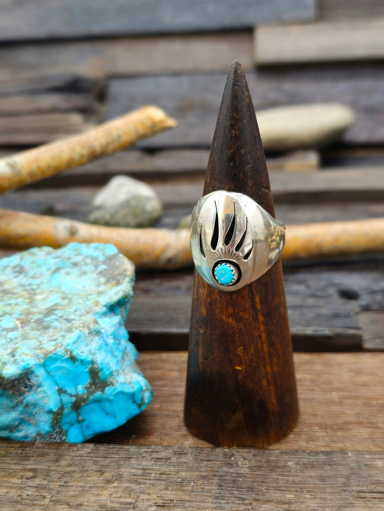 Sterling Silver Turquoise Badger Paw Overlay Ring by Rose Ann Silago. All jewelry is handcrafted by Indigenous Artists.  Dimensions - Size 11 1/...