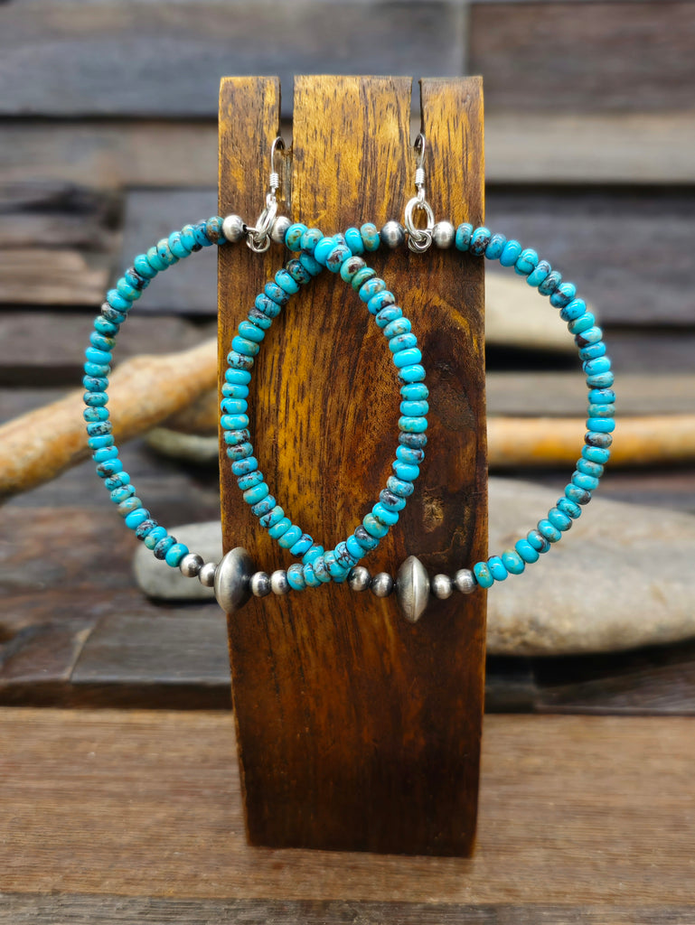 Blue Turquoise and Sterling Silver Bead Hanging Hoop Earrings. Individual stones will vary.  All jewelry is handcrafted by Indigenous Artists.  ...