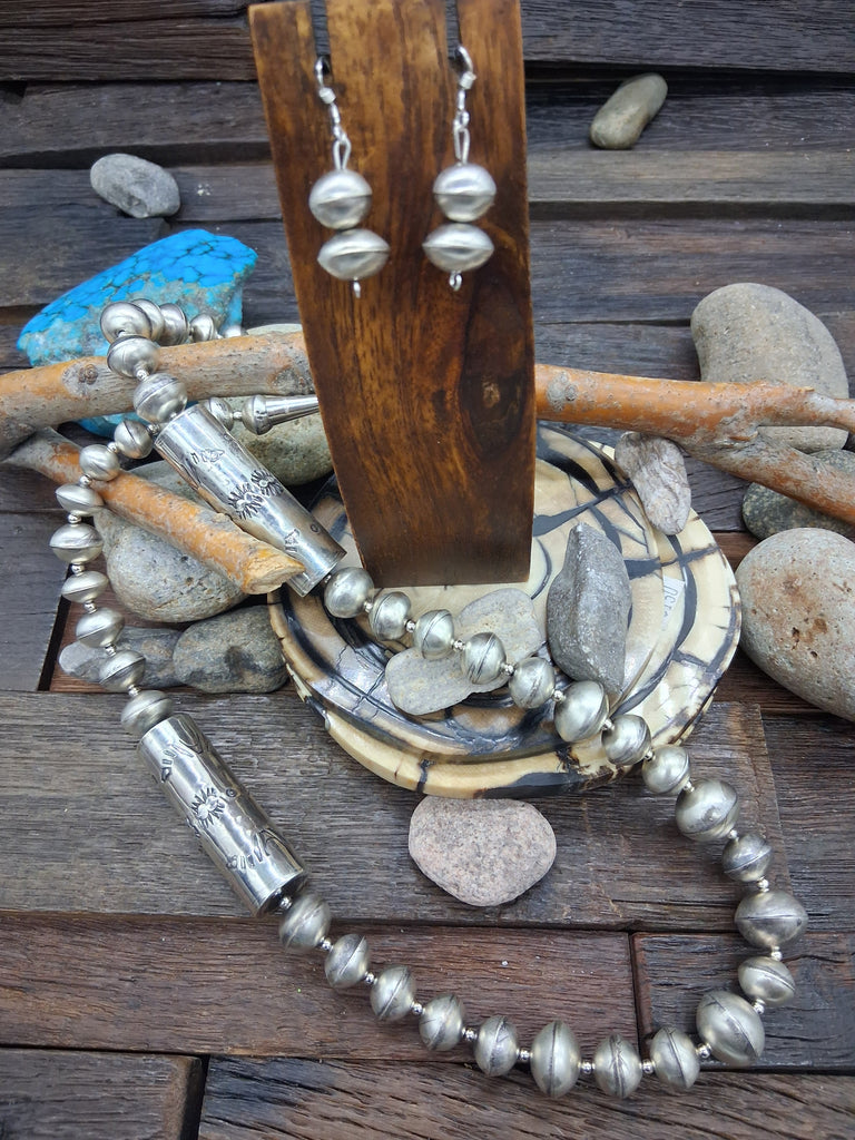Sterling Silver Beaded Necklace with Large Cylinder Beads and Hook Dangle Earrings Set by Navajo Silversmiths Stamped 'B.S.' All jewelry is handcra...