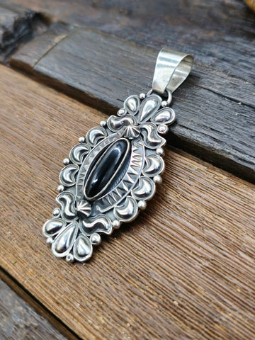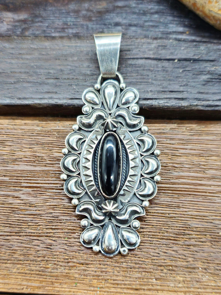 Sterling Silver Black Onyx Oval Pendant by Navajo silversmith Derrick Gordon All jewelry is handcrafted by Indigenous Artists.  Dimensions: Leng...