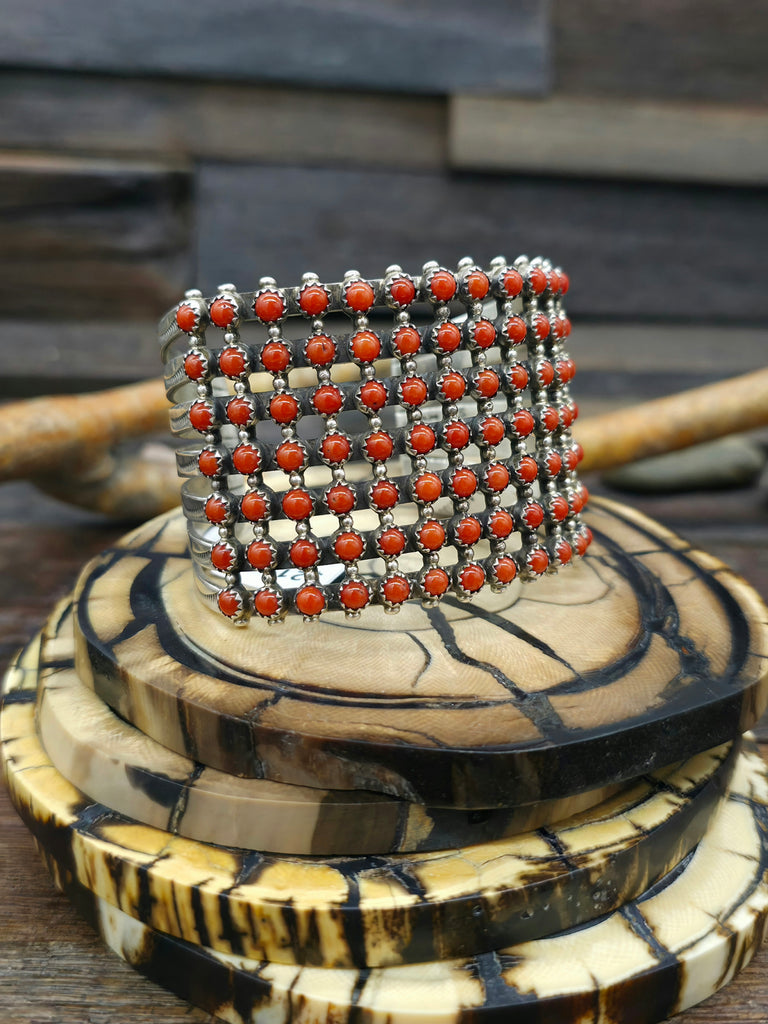 Sterling Silver Coral 7 Row Cuff by Navajo silversmith Henry Sam. All jewelry is handcrafted by Indigenous Artists.  D8imensions: Internal Circu...