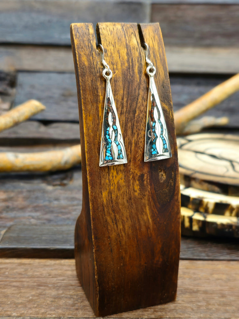 Sterling Silver Chip Inlay Coral and Turquoise Earrings by Navajo silversmith Joleen Yazzie. All jewelry is handcrafted by Indigenous Artists.  Ind...