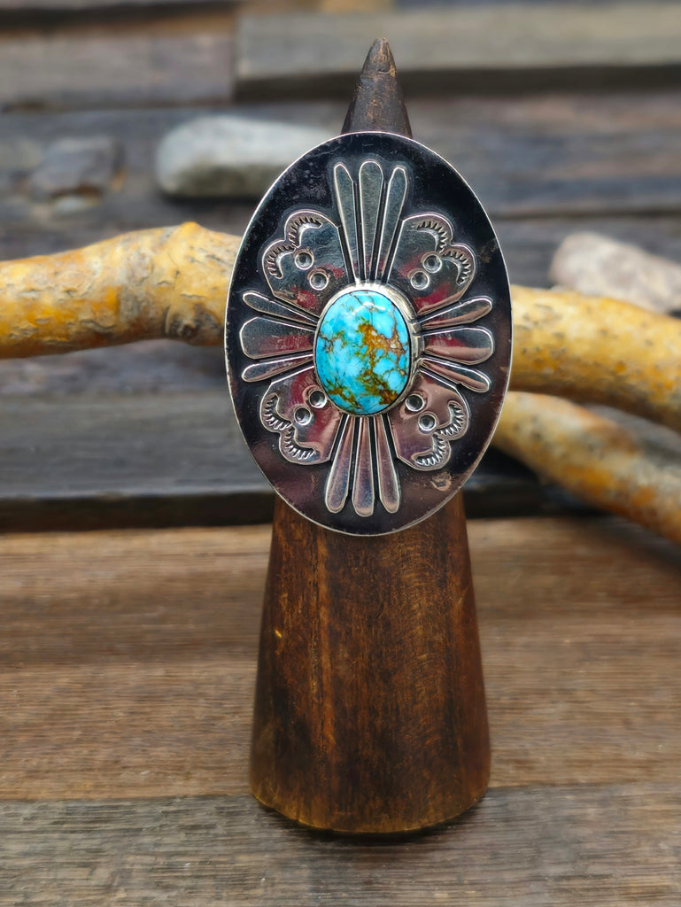 Sterling Silver Overlay and Turquoise Ring by Navajo silversmith Marila Benally. All jewelry is handcrafted by Indigenous Artists.  Dimensions: ...