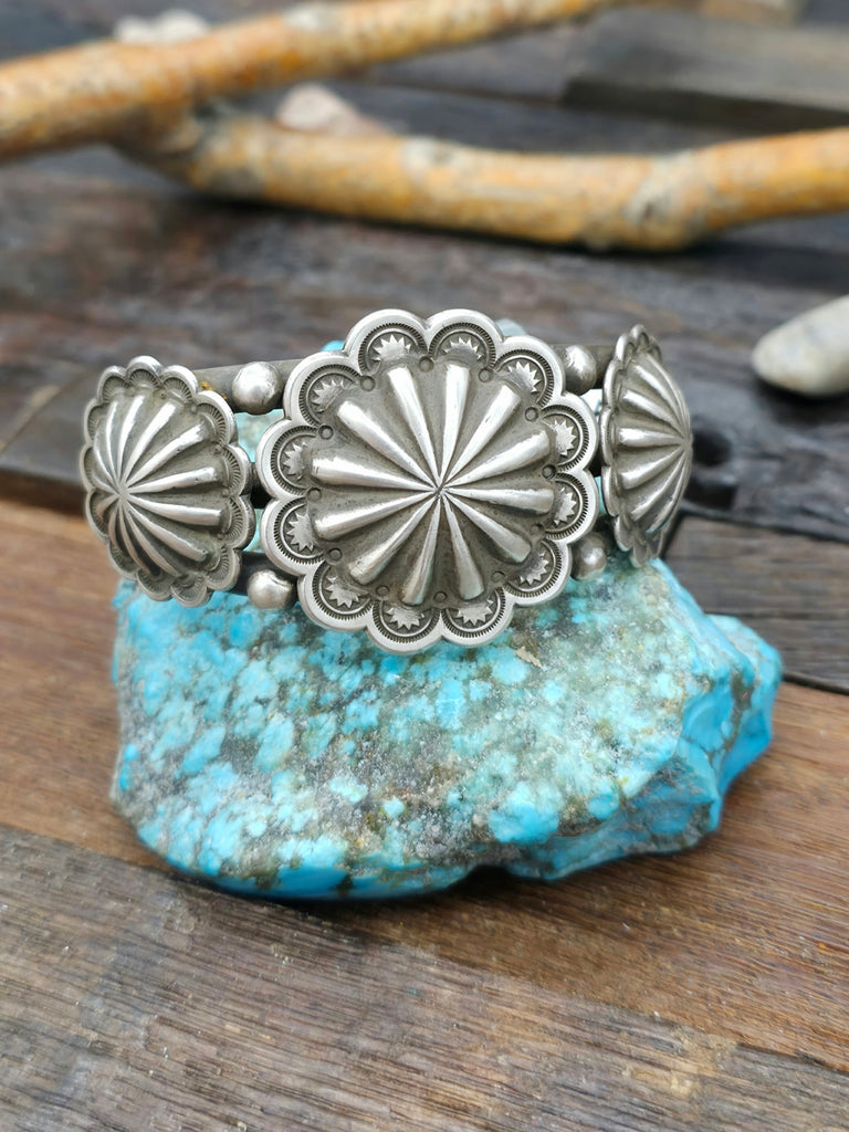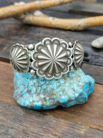 Repousse Stamped Sterling Silver Cuff.  Stamped "ESS" by a Navajo silversmith. All jewelry is handcrafted by Indigenous Artists.  Dimensions: In...