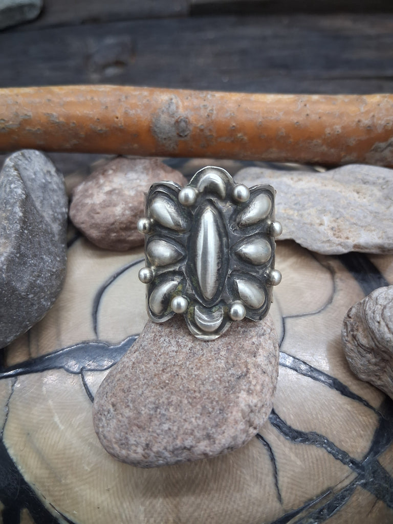 Sterling Silver Stamped Ring. Made by Navajo Silversmith Richard Jim. All jewelry is handcrafted by Indigenous Artists. Dimensions: 1in Width