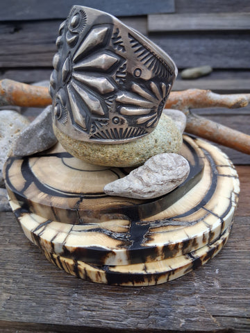 Sterling Silver Stamped Cuff. Made by a Navajo silversmith Elvira Bill. All jewelry is handcrafted by Indigenous Artists.  Dimensions: 6 3/4in B...