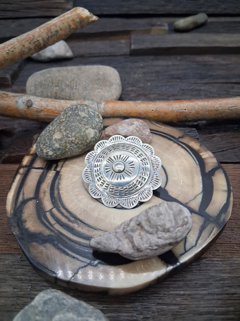 Sterling Silver Stamped Navajo Pin. By Navajo Silversmith Bertha Begay. All jewelry is handcrafted by Indigenous Artists.   Dimensions: 1 1/2 In...