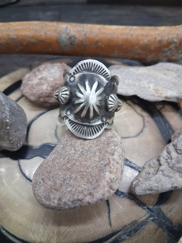 Sterling Silver Stamped Starshot Band Size 9 3/4. Made by Navajo Silversmith Richard Jim. All jewelry is handcrafted by Indigenous Artists. Dime...