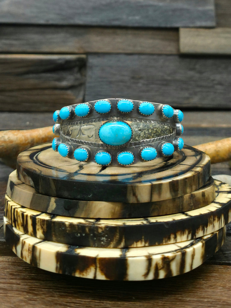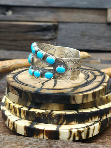 Stamped Sterling Silver Turquoise Cuff by Navajo silversmith Joann Spencer. All jewelry is handcrafted by Indigenous Artists.  Dimensions: Inter...