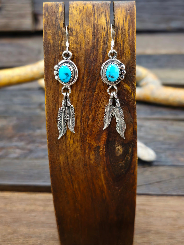 These sterling silver feather earrings feature a turquoise stone and are made by Navajo artist  Rita Largo.  Individual stones will vary.  All jewe...