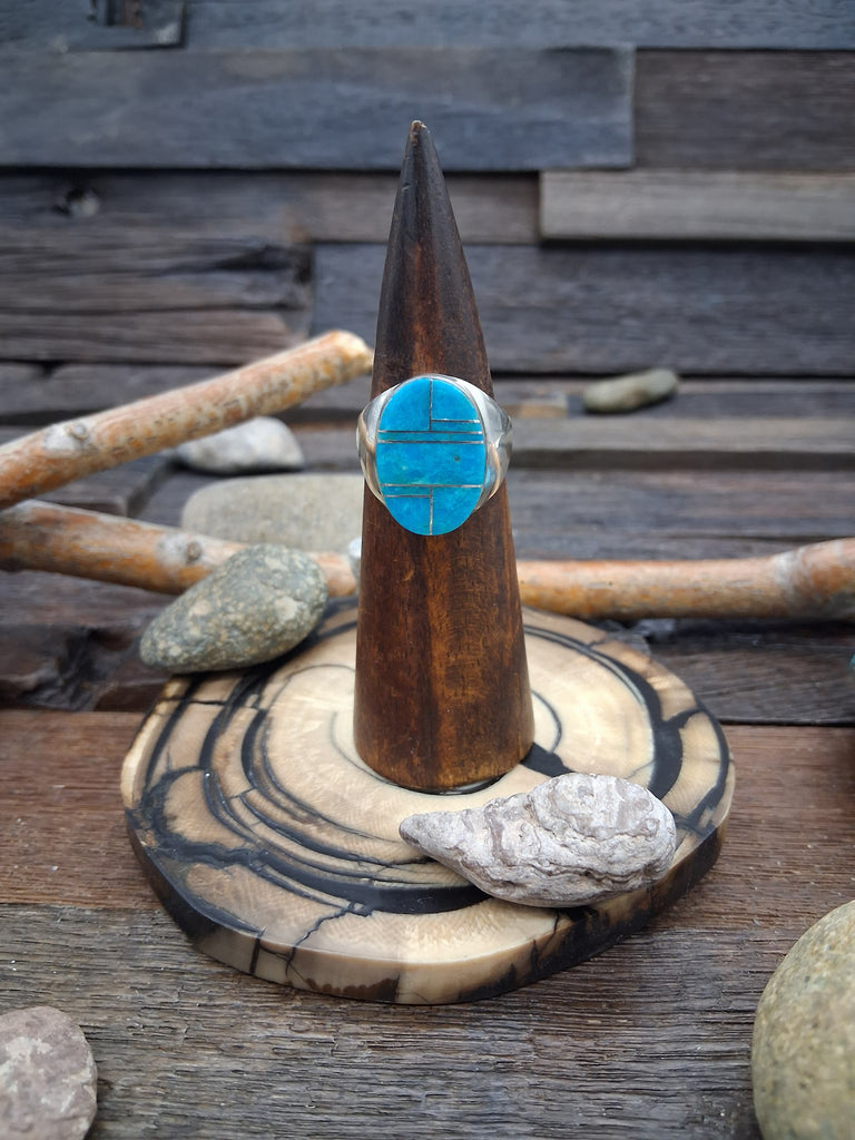 Sterling Silver Turquoise Inlay Ring Size 11.  By Native Silversmith Wilbert Gray. All jewelry is handcrafted by Indigenous Artists.    Dimensio...