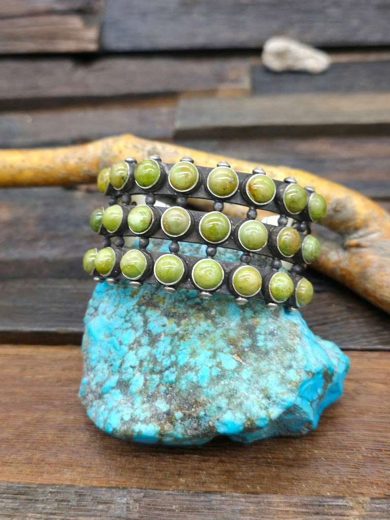 Two Row Green Turquoise Cuff.  Stamped "SH" by a Navajo silversmith. All jewelry is handcrafted by Indigenous Artists.  Individual stones may vary....