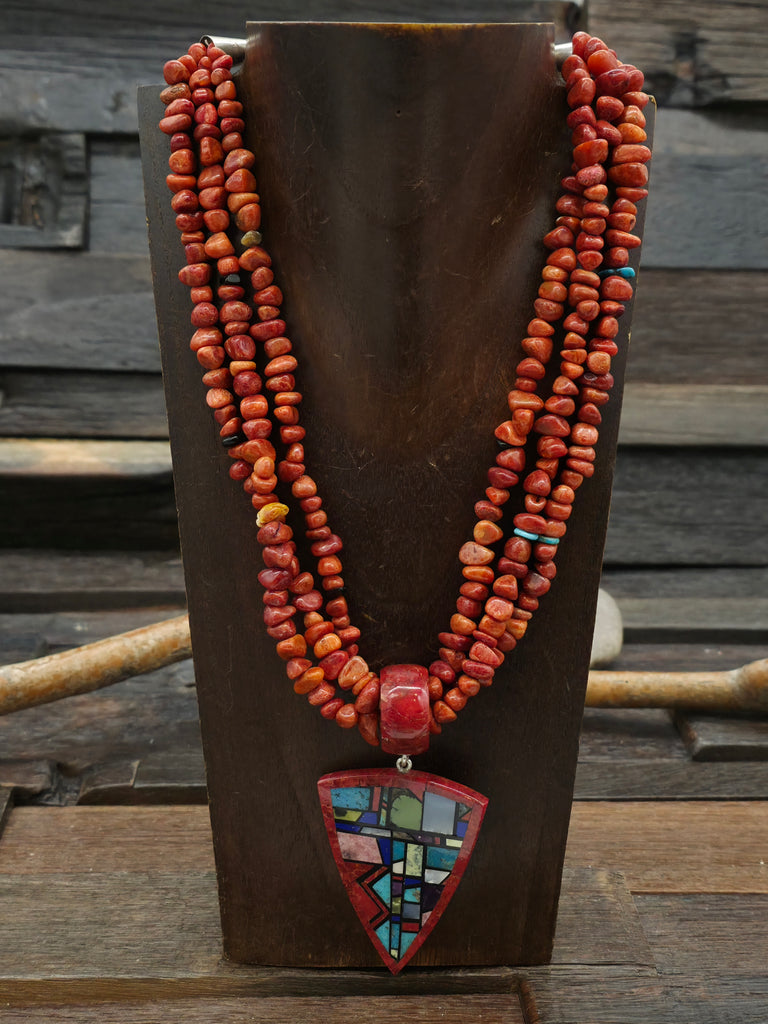 Three Strand Apple Coral and Multi Stone Necklace with Mosaic Inlay Pendant by Chris Nieto - 18 in.