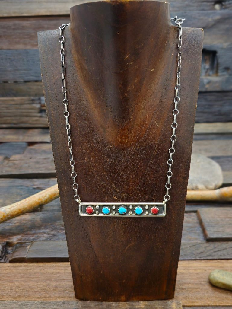 This bar necklace features two coral stones, three turquoise stones, and an oxidized sterling silver chain.  Made by Navajo silversmith Paul Largo....