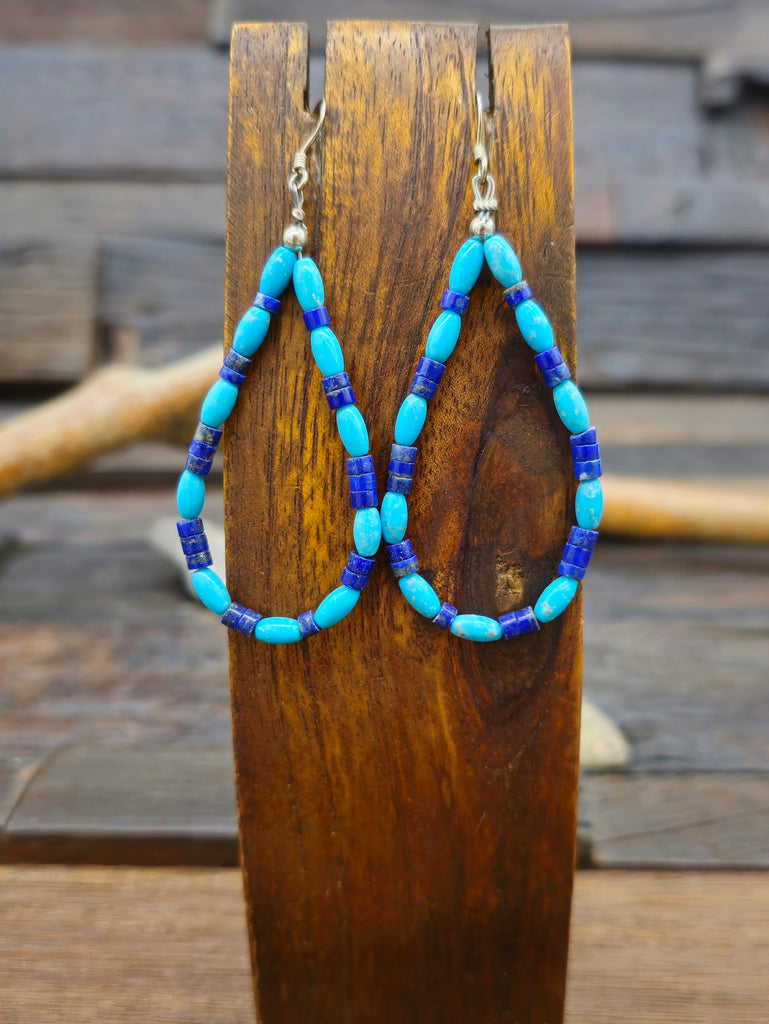 Turquoise and Lapis Bead Earrings by Fred Archuleta. All jewelry is handcrafted by Indigenous Artists.  Dimensions: 2 1/2 in. by 1 in.