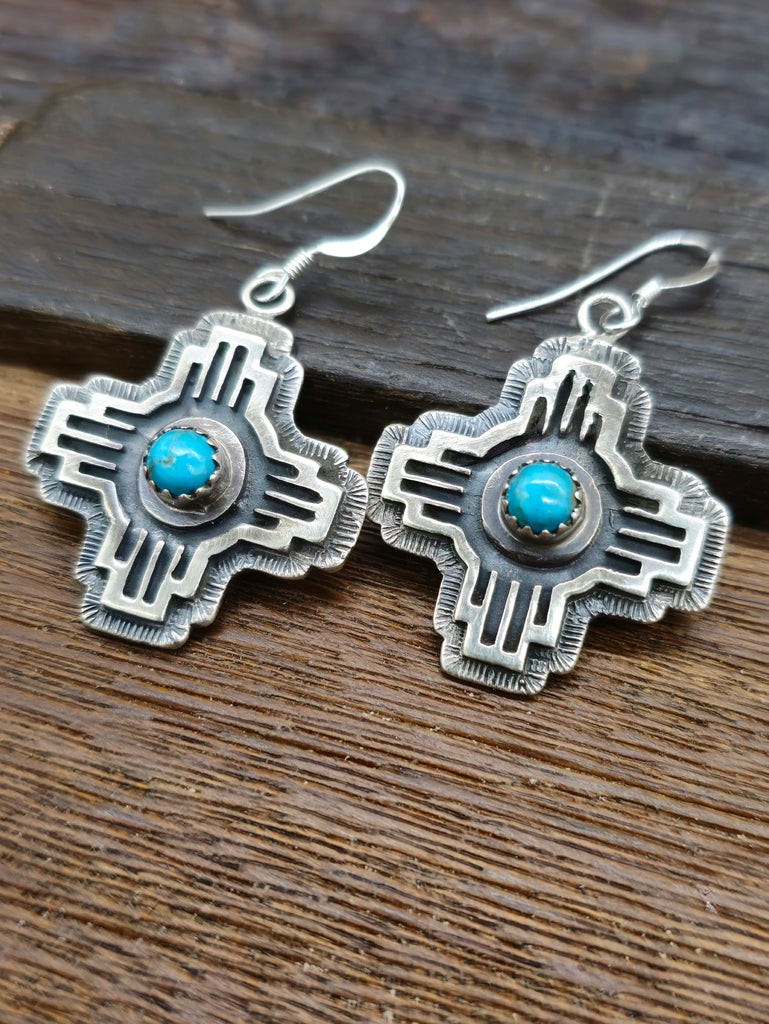 Turquoise and Sterling Silver Overlay Zia Symbol Earrings by Kenny Lonjose